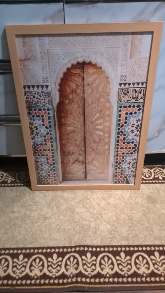 Ce tableau met en avant une porte orientale sculptée, entourée de mosaïques colorées. L’ensemble crée un contraste visuel qui capte l’attention et ajoute une vraie personnalité à votre salon, chambre ou bureau.